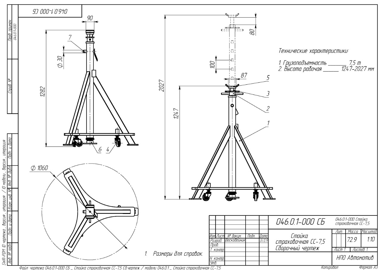 Основное преимущество страховочной стойки СС7500 заключается в ее высокой грузоподъемности, которая составляет 7500 кг. Это позволяет использовать стойку для работы с различными по весу моделями грузового автотранспорта. Размеры стойки очень удобны: минимальная высота 1247 мм и максимальная высота 2027 мм. Такие характеристики обеспечивают возможность работы с автомобилями различной высоты и типами подвески, что делает данное оборудование универсальным для различных задач.