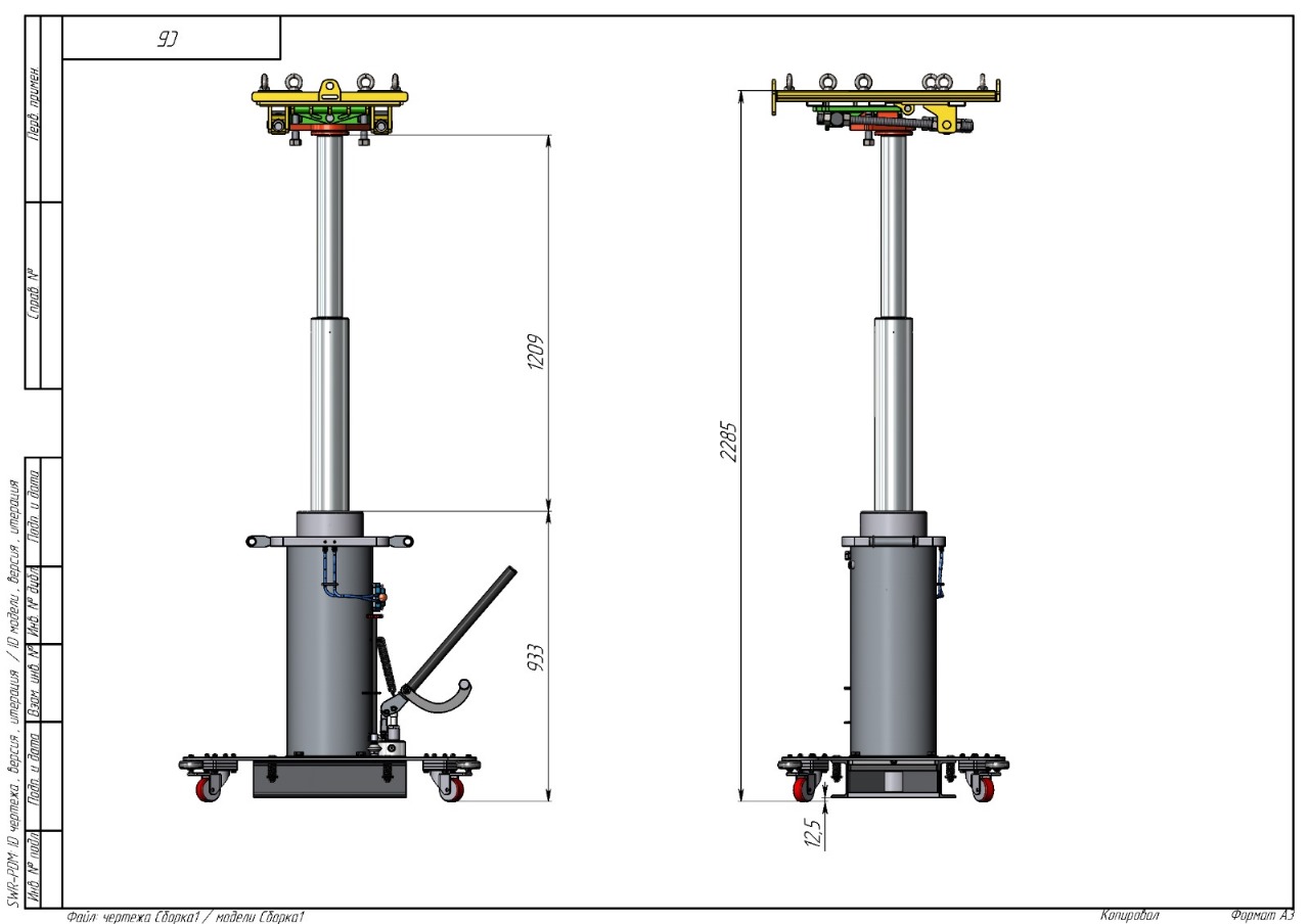 Габариты основания подъемника составляют 750 мм на 900 мм, а его масса — 270 кг. Мобильный характер устройства позволяет ему легко перемещаться по смотровой яме на колесах, что значительно экономит место и время в сервисе. Стоит отметить, что при нагрузке более 1000 кг каретка полностью «садится» на пол, что увеличивает стабильность и безопасность работы.